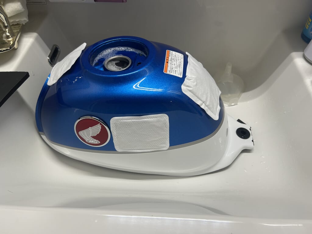 錆取り剤は、ある程度温度が高い方がその効果を発揮するという事だったので、タンクに貼るカイロをつけて温めてやってみたところ、コレが効果てきめん!