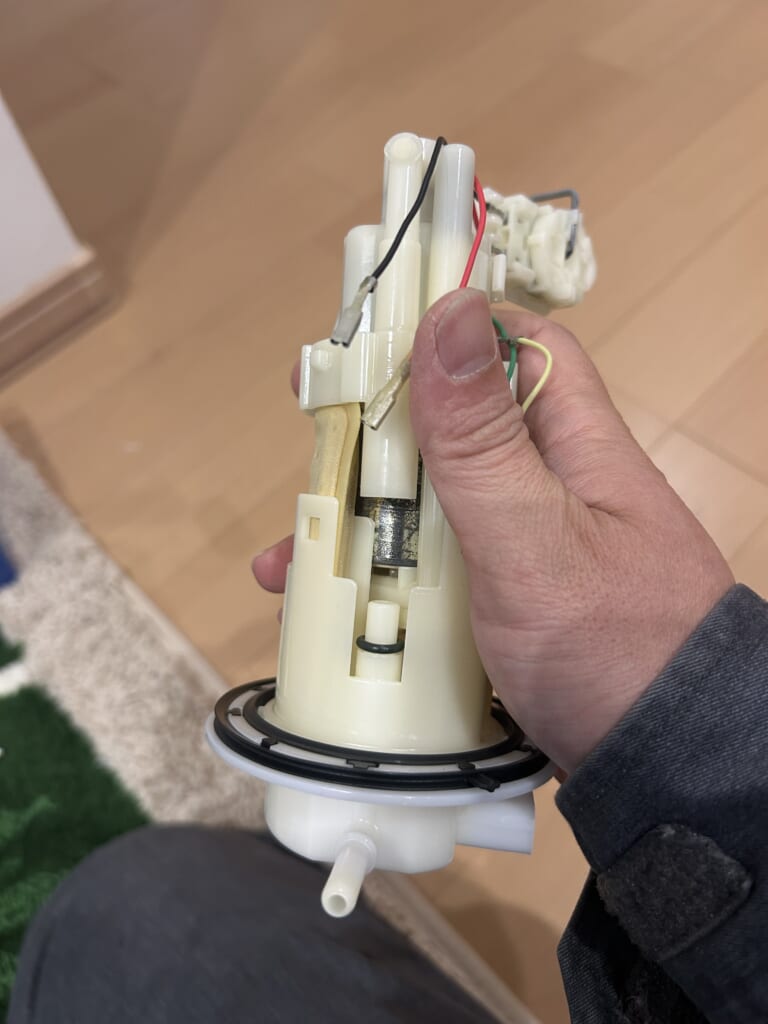 ポンプユニットは、フィルタ―とケーシング、燃料計を作動させる浮き、そしてポンプモータを基本として構成されていた。とりあえず分解してポンプモータを取り出し、良く乾かしてから12Vを印加してみたのだが・・・