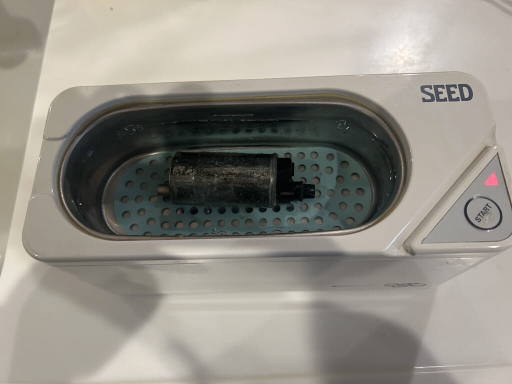 そこで、○ルカリで2000円くらいで販売されていた超音波洗浄機を購入し、ポンプモータと、ついでにインジェクターを漬けこんで超音波洗浄にかけてみたところ、煙のように汚れがとめどなく出て来たのであった。