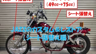 設営130日目 今回はHONDAの懐かしきミニアメリカン、JAZZのカスタム&レストアにチャレンジしました。この車体は以前、フロントフォークのシール&オイル変えなどを行ったのですが、今回は思い切って色々やっちゃう事に!今回は、初めての試みで...